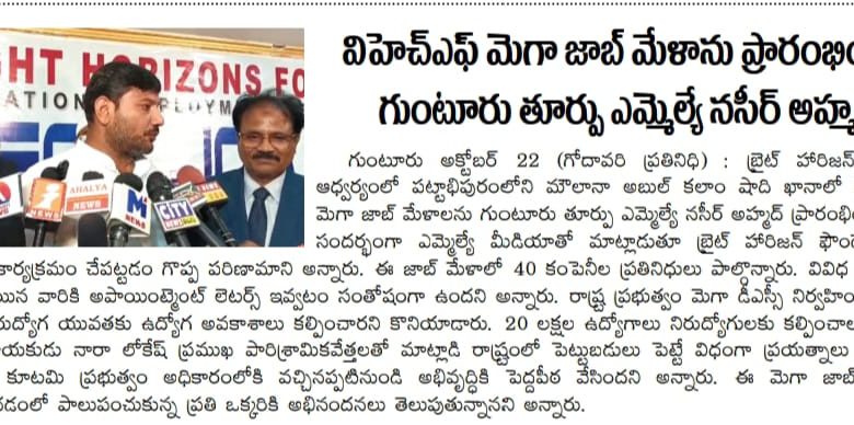 Guntur Vidya, October 22, Prabhatavartha The mega job fair held at Maulana Abul Kalam Azad Urdumar in Pattabhipuram on Wednesday under the auspices of Bright Horizons Foundation received a great response from the candidates. Candidates from various areas participated in the job fair in large numbers. About 40 companies participated and prepared to provide large-scale jobs to the candidates based on their qualifications. Foundation Chairman MKS Mohinuddin and his team worked hard for the job fair. East MLA Nasir attended the program and addressed the candidates. Some eligible candidates were handed over their employment documents by the hands of the MLA. Along with the candidates, their parents and relatives also came to Urughar, and the two conference halls of Urdumar were packed with candidates. The MLA expressed special gratitude to the CEO of Shaar Company for coordinating representatives of 40 private companies and bringing them all together on one platform to support the organization of the mega job fair.